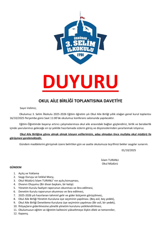 OKUL AİLE BİRLİĞİ GENEL KURUL TOPLANTI DUYURUSU